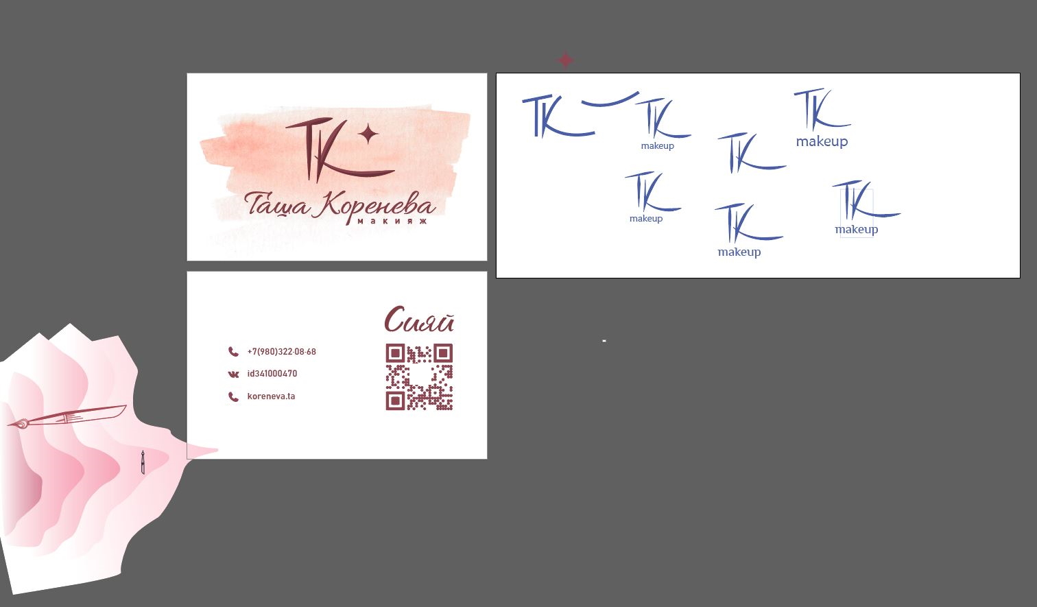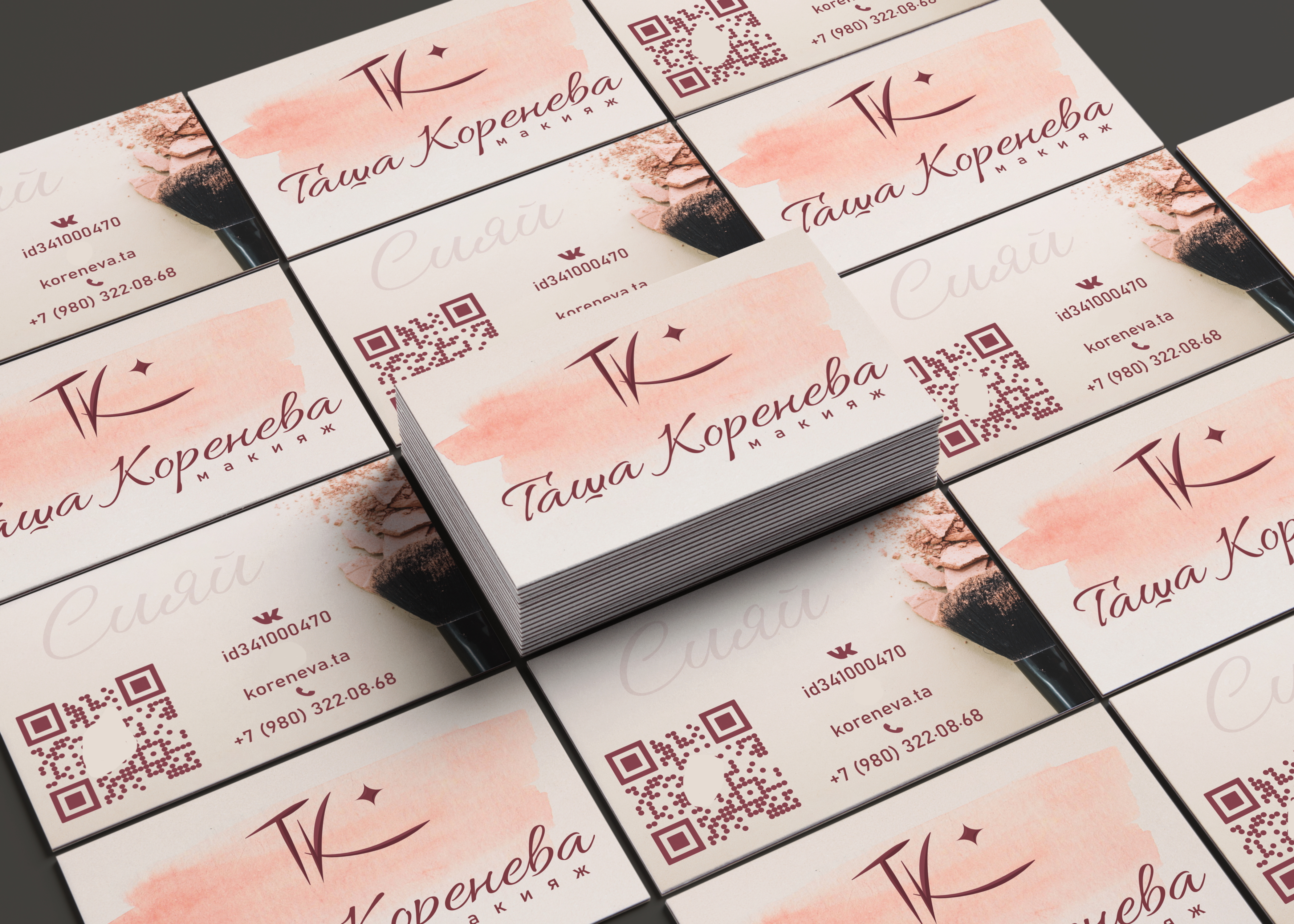 Разработка логотипа и дизайна визитных карточек для Натальи Кореневой. Был запрос на пастельные тона, а также на многофункциональный QR-код. который при наведении позволяет автоматически добавить в контакты телефона всю основную информацию о Таше. Заказчик остался очень доволен результатом!