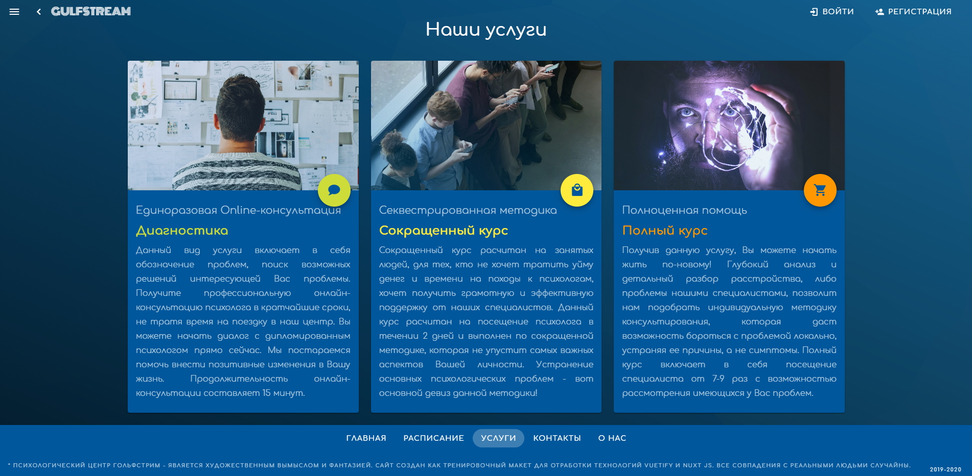 Многостраничный сайт для агенства психологической помощи Gulfstream. Реализовано расписание специалистов, чат. Проект создан с помощью Vuetify и Nuxt JS.